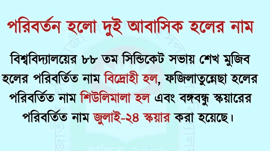 এমতাবস্থায় সিন্ডিকেট প্রশাসন সূত্রে জানা যায়-`শিক্ষার্থীদের দাবির ভিত্তিতেই দুই আবাসিক হল এবং বঙ্গবন্ধু স্কোয়ারের নাম পরিবর্তন করা হয়েছে'।