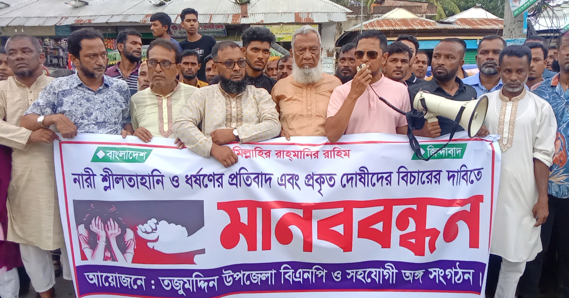 ভোলার তজুমদ্দিন উপজেলায় স্বামীকে বেঁধে রেখে স্ত্রীকে ধর্ষণের মর্মান্তিক ঘটনার প্রতিবাদে মানববন্ধন করেছে বাংলাদেশ জাতীয়তাবাদী দল-বিএনপি’র অঙ্গ ও সহযোগী সংগঠনগুলো। মঙ্গলবার দুপুরে উপজেলা সদরে আয়োজিত মানববন্ধনে অংশ নিয়ে বক্তারা নারী নির্যাতন ও ধর্ষণের ঘটনার তীব্র নিন্দা জানান এবং প্রকৃত দোষীদের দ্রুত আইনের আওতায় এনে দৃষ্টান্তমূলক শাস্তির দাবি জানান।