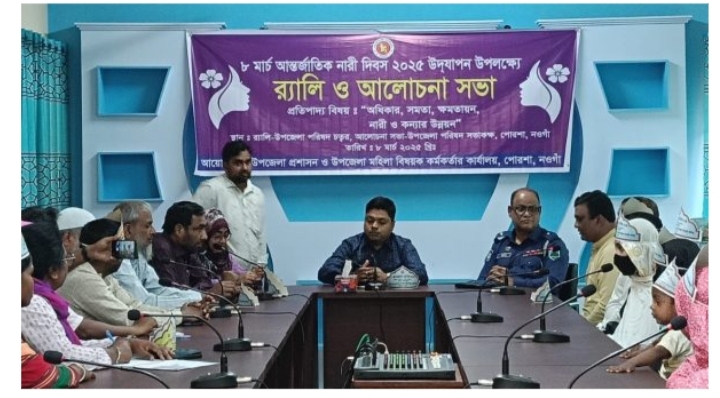 “অধিকার, সমতা, ক্ষমতায়ন, নারী ও কন্যার উন্নয়ন” এই ¯স্লোগানকে সামনে রেখে নওগাঁর পোরশায় আন্তর্জাতীক নারী দিবস পালন করা হয়েছে। দিবসটি উপলক্ষে শনিবার বিকালে উপজেলা প্রশাসনের সহযোগিতায় ও মহিলা অধিদপ্তরে আয়োজনে র‌্যালী ও আলোচনা সভা অনুষ্ঠিত হয়। র‌্যালী শেষে উপজেলা পরিষদ মিলনায়তনে এক আলোচনা সভা অনুষ্ঠিত হয়। উক্ত সভায় সভাপতিত্ব করেন উপজেলা নির্বাহী কর্মকর্তা আরিফ আদনান। অন্যান্যদের মধ্যে উপজেলা সহকারী কমিশনার (ভুমি) নাবিলা ফেরদৌস, থানা অফিসার ইনচার্জ আবু বক্কর সিদ্দির, নিতপুর সরকারি স্কুল এন্ড কলেজের প্রভাষক মিছ বাহ-উল হক সহ বিভিন্ন দপ্তরের কর্মকর্তা, কর্মচারী স্থানীয় গণ্যমান্য ব্যক্তিবর্গ উপস্থিত ছিলেন। বক্তারা বলেন, নারীরা পুরুষদের থেকে পিছিয়ে নেই তারা এখন অনেক কর্মঠ দক্ষশীল হয়ে তৈরি হচ্ছে। তাই তাদের প্রতি আমাদের স্নেহ ও ভালোবাসা এবং সাহস জোগাতে হবে তারা যেন ভবিষ্যতে আরো ভালো কিছু করে দেখাতে পারে এজন্য তাদেরকে উৎসাহিত করতে হবে। পরিশেষে সভাপতি সাহেব নারীদের আরো উন্নয়নশীল কর্মকাণ্ডে আগ্রহশীল হওয়ার জন্য সুপরামর্শ প্রদান করেন।