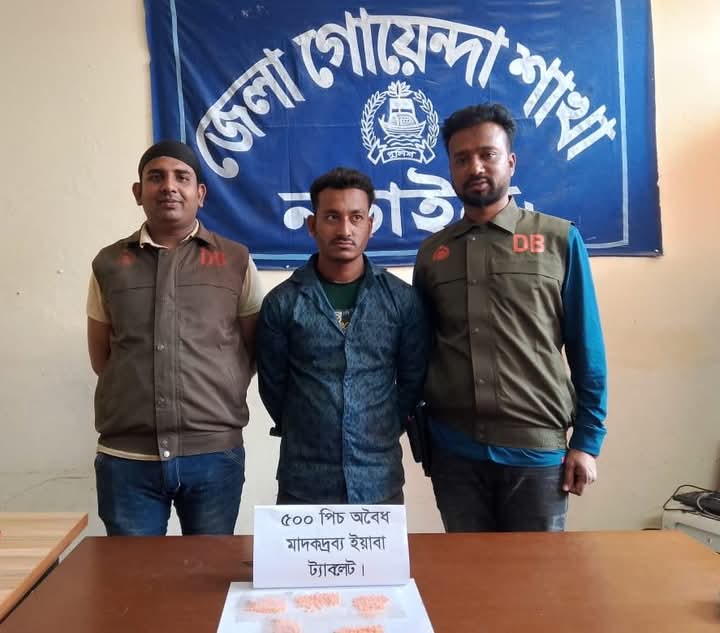 নড়াইলে ডিবি পুলিশের সফল অভিযানে পাঁচশত পিস ইয়াবা ট্যাবলেটসহ একজন গ্রেফতার। রিদয় (২৮) নামের একজন মাদক কারবারিকে গ্রেফতার করেছে নড়াইল জেলা গোয়েন্দা পুলিশ গ্রেফতারকৃত রিদয় (২৮) যশোর জেলার কোতয়ালী থানাধীন বিবি রোডের মোঃ ইনতাজুল হকের ছেলে। সোমবার (১০ ফেব্রুয়ারি) নড়াইল সদর থানাধীন ৪ নং আউড়িয়া ইউনিয়নের সীমাখালী গ্রামস্থ মালিবাগ মোড় আর্মি ক্যাম্পের সামনে নড়াইল থেকে লক্ষীপাশা গামী হামদার্দ এক্সপ্রেস বাস পরিবহন হতে তাদের আটক করা হয়। গোপন সংবাদের ভিত্তিতে জেলা গোয়েন্দা শাখার অফিসার ইনচার্জ  মোঃ শাহাদারা খান (পিপিএম) এর তত্ত্বাবধানে এসআই (নিঃ) মোঃ অহিদুর রহমান,এএসআই (নিঃ) নাহিদ নিয়াজ ও এএসআই (নিঃ) তুহিন আলী সঙ্গীয় ফোর্সসহ অভিযান চালিয়ে রিদয় (২৮)কে গ্রেফতার করে। এ সময় ধৃত আসামির নিকট থেকে মাদকদ্রব্য পাঁচশত পিস ইয়াবা ট্যাবলেট জব্দ করা হয়। এ সংক্রান্তে নড়াইল সদর থানায় মাদকদ্রব্য নিয়ন্ত্রণ আইনে একটি মামলা রুজু করা হয়েছে। আসামিকে বিজ্ঞ আদালতে সোপর্দ করা হয়েছে। নড়াইল জেলা পুলিশ সুপার কাজী এহসানুল কবীর’র নির্দেশনায় মাদকমুক্ত নড়াইল গড়ার লক্ষ্যে জেলা পুলিশ আন্তরিকভাবে কাজ করে যাচ্ছে।