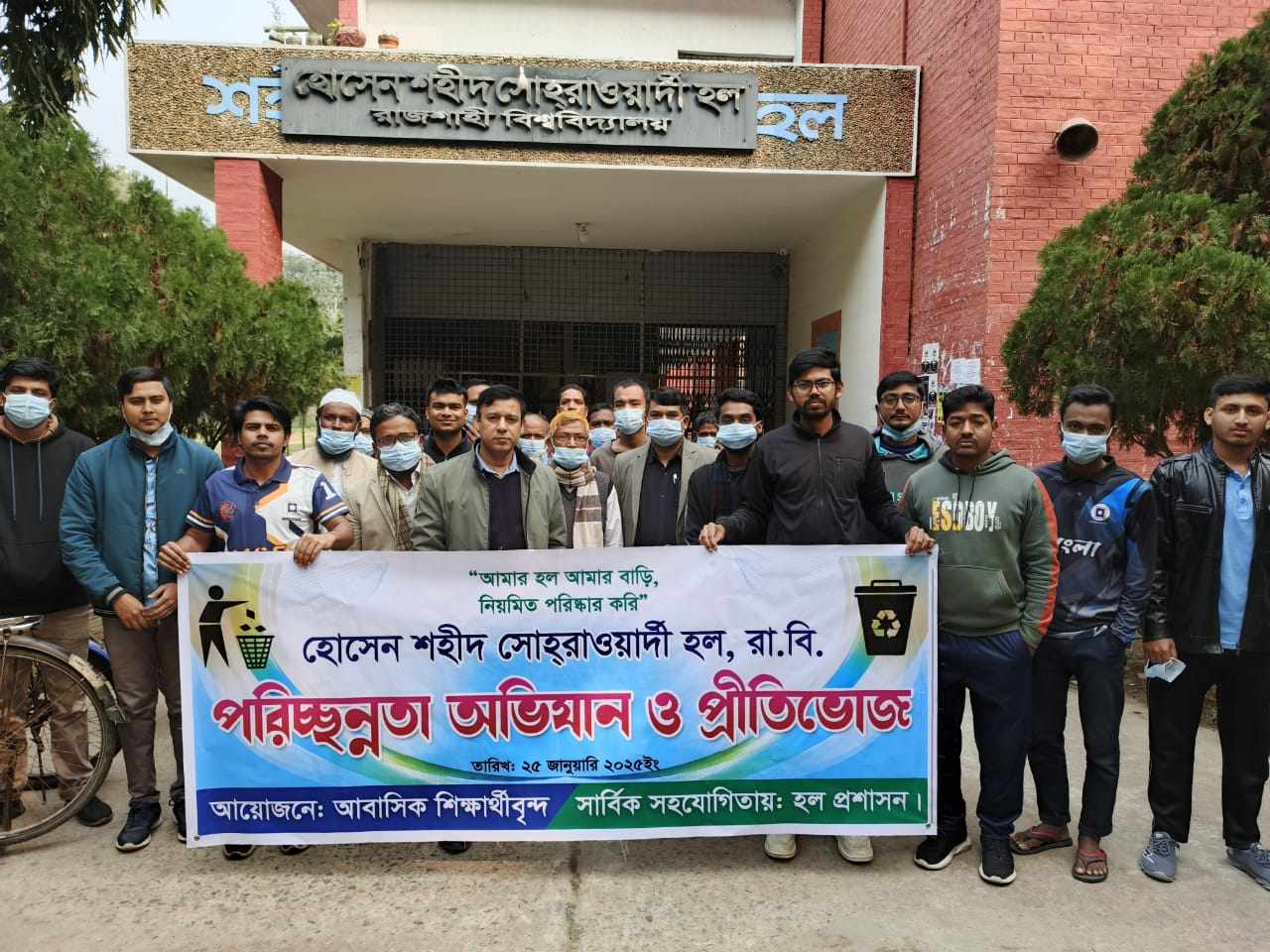 নিজেদের হলের পরিবেশ সুন্দর রাখতে পরিষ্কার-পরিচ্ছন্নতা অভিযান করেছেন রাজশাহী বিশ্ববিদ্যালয়ের হোসেন শহীদ সোহরাওয়ার্দী হলের আবাসিক শিক্ষার্থীরা। এতে স্বতস্ফূর্তভাবে শতাধিক শিক্ষার্থী অংশগ্রহণ করেন।