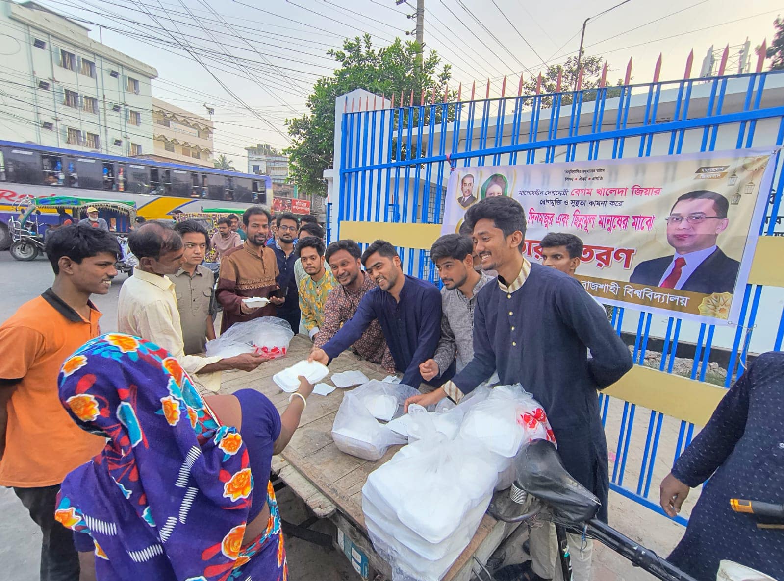 বিএনপি চেয়ারপার্সন বেগম খালেদা জিয়ার রোগমুক্তি ও সুস্থতা কামনা করে রাজশাহী বিশ্ববিদ্যালয় (রাবি) ক্যাম্পাসে দুস্থ, দিনমজুর এবং ছিন্নমূল মানুষের মাঝে ইফতার বিতরণ করেছে বিশ্ববিদ্যালয় শাখা বাংলাদেশ জাতীয়তাবাদী ছাত্রদল। গতকাল বিকাল সাড়ে ৫টায় ক্যাম্পাসের চতুর্থ বিজ্ঞান ভবন, টুকিটাকি চত্বর এবং কাজলা গেটে এ ইফতার বিতরণ করা হয়।