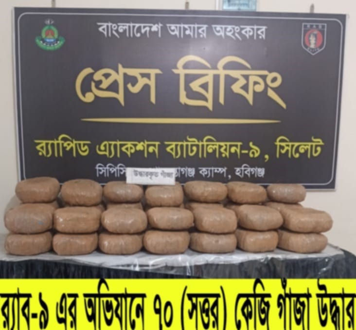 প্রেস বিজ্ঞপ্তিতে উল্লেখ করা হয়, গোপন সংবাদের ভিত্তিতে বৃহস্পতিবার দিবাগত ভোর সাড়ে পাঁচটার দিকে র‍্যাব-৯ এর শায়েস্তাগঞ্জ ক্যাম্পের একটি দল অলিপুর রেলগেট এলাকায় অভিযান চালায়। এ সময় ৭০ কেজি গাঁজাসহ দুই মাদক কারবারিকে আটক করে।