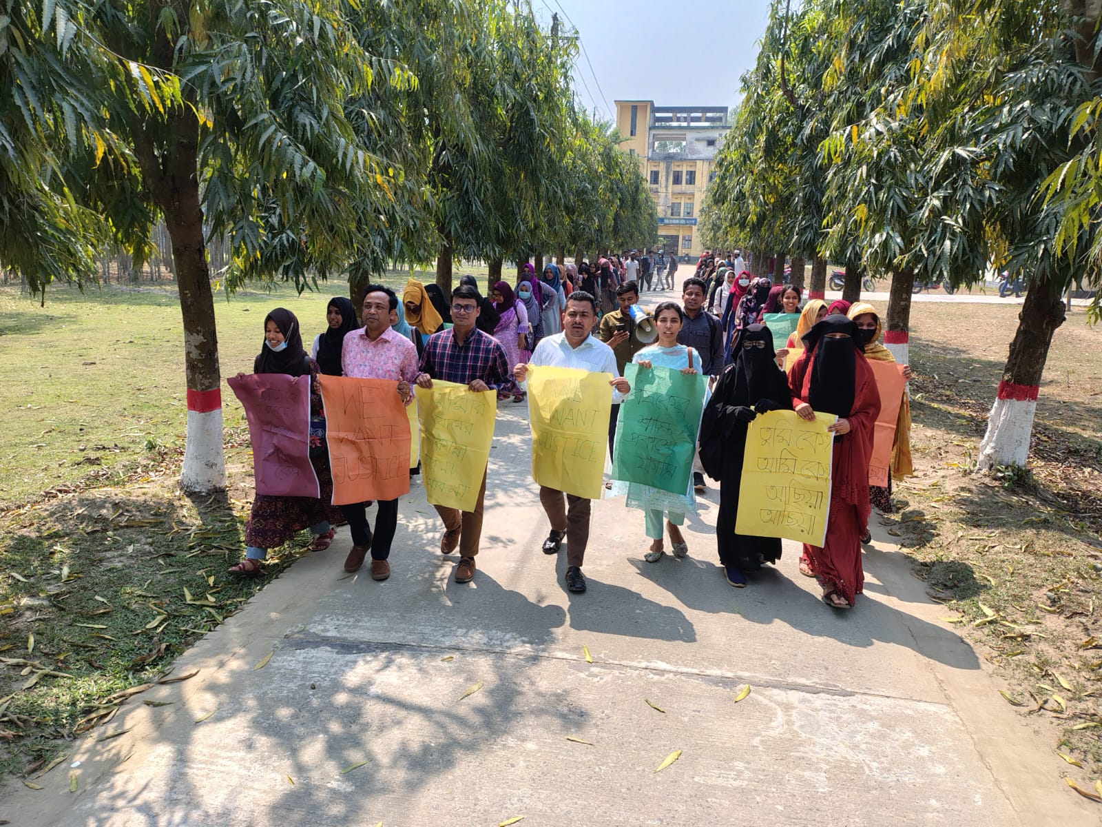 আজ রবিবার (৯ মার্চ) সকাল ১১ টায় বিশ্ববিদ্যালয়ের একাডেমিক ভবনের শিক্ষার্থীরা জড়ো হন। পরে সেখান থেকে একটি মিছিল বের হয়ে বিশ্ববিদ্যালয়ের মূল ফটক প্রদক্ষিণ করে প্রশাসনিক ভবনের সামনে এসে শেষ করেন। এসময়ে সমাজকর্ম বিভাগের সহকারী অধ্যাপক ড. আল মামুন সরকার, এবং প্রভাষক হোসাইন মাহমুদ এবং ইমরুল কবিরের অধিনে শিক্ষার্থীদের মিছিল বের হয়।