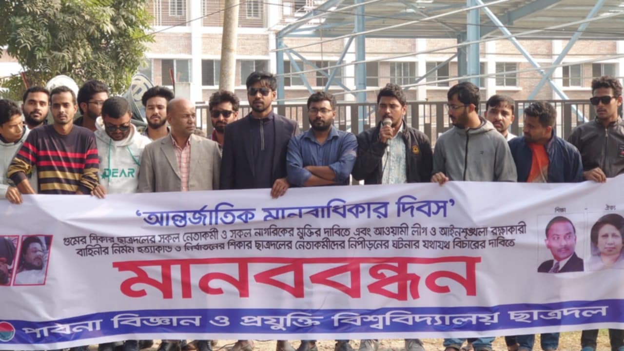 আন্তজার্তিক মানবাধিকার দিবস উপলক্ষে মানব বন্ধন করেছেন পাবনা বিজ্ঞান ও প্রযুক্তি বিশ্ববিদ্যালয় শাখা ছাত্রদল।