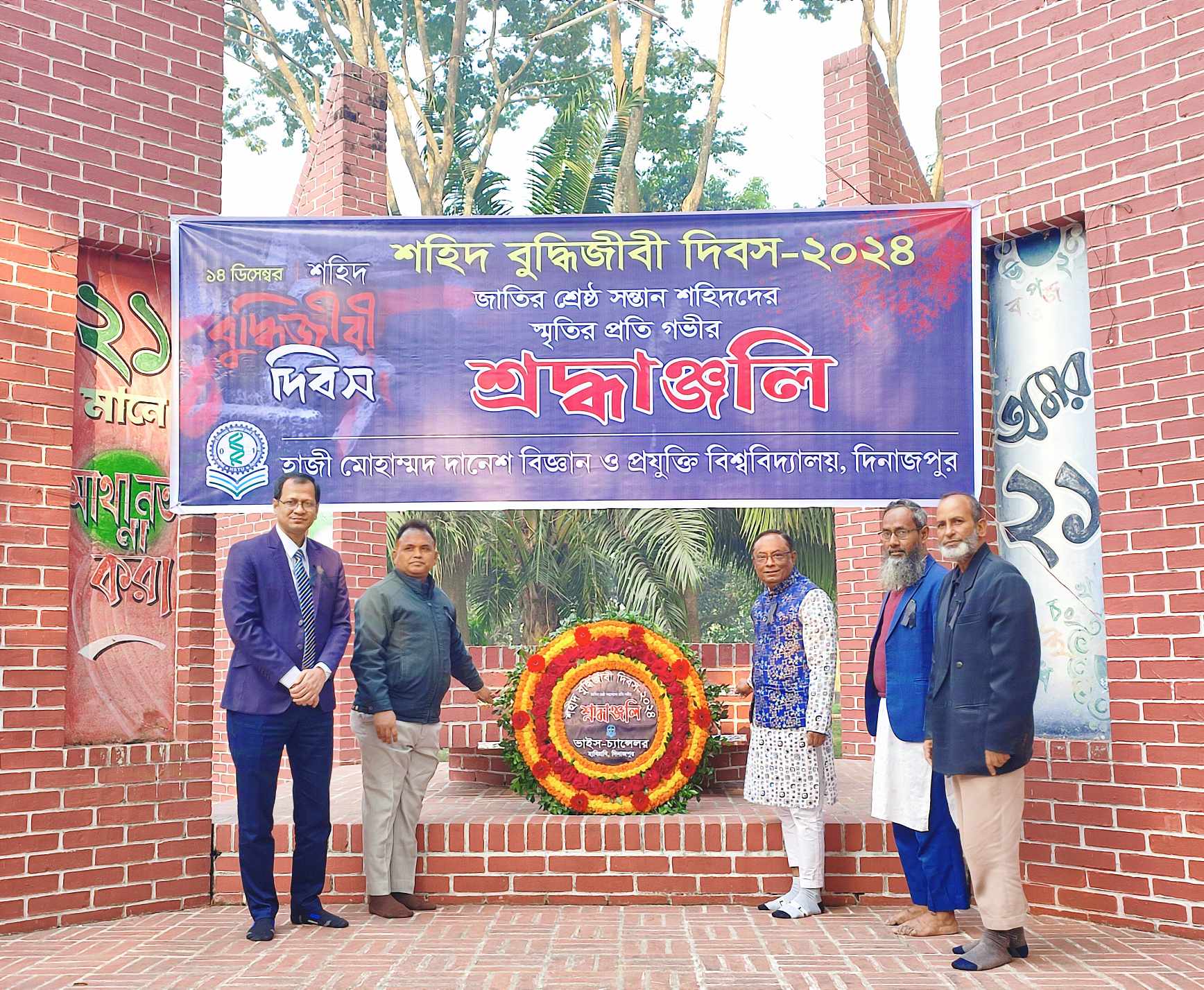 আজ শনিবার (১৪ ডিসেম্বর) সকাল ৯টায় বিশ্ববিদ্যালয়ের কেন্দ্রীয় শহীদ মিনারের সামনে হাবিপ্রবির ভাইস চ্যান্সেলর, প্রো ভাইস চ্যান্সেলর, শিক্ষক, কর্মকর্তা, শিক্ষার্থী ও কর্মচারীরা কালো ব্যাজ ধারণ করেন। অতঃপর ভাইস চ্যান্সেলর অধ্যাপক ড. মো. এনামউল্যা ও প্রো ভাইস চ্যান্সেলর অধ্যাপক ড. মো. শফিকুল ইসলাম সিকদারের নেতৃত্বে বিশ্ববিদ্যালয় প্রশাসনের পক্ষ থেকে শহীদ মিনারে পুস্পস্তবক অর্পণ করে শহীদ বুদ্ধিজীবীদের স্মৃতির প্রতি শ্রদ্ধা জ্ঞাপন করা হয়।