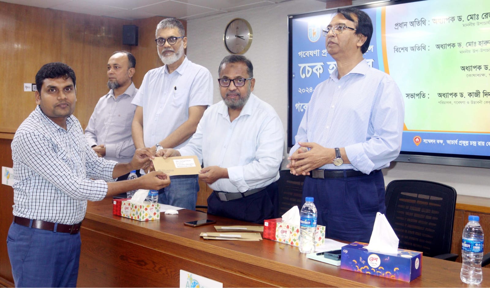 খুলনা বিশ্ববিদ্যালয়ে ২০২৪-২৫ অর্থবছরের রাজস্ব/উন্নয়ন বাজেটের আওতায় গবেষণা প্রকল্পের অনুকূলে বরাদ্দকৃত অর্থের প্রথম পর্যায়ের চেক হস্তান্তর করা হয়েছে।