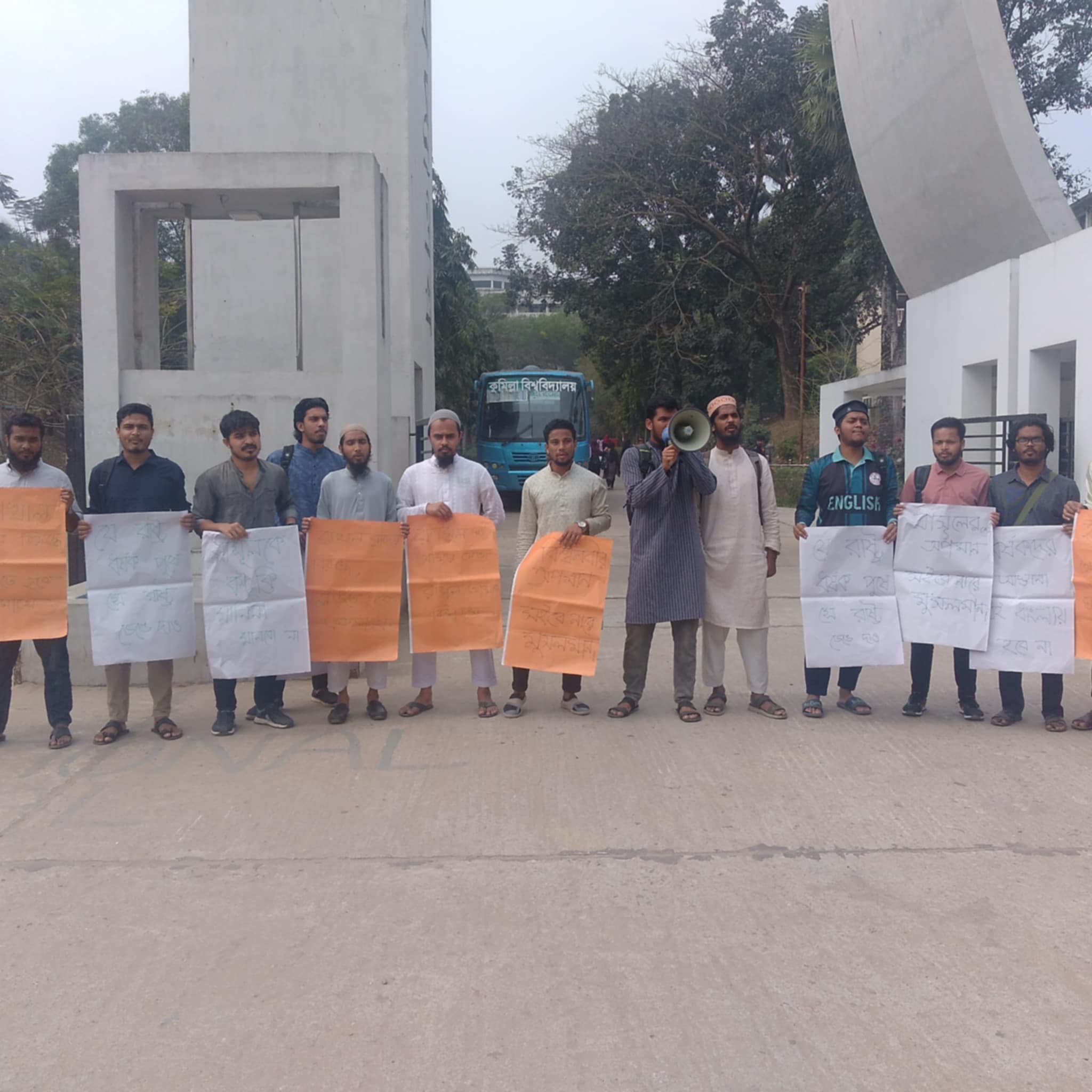 এ সময় ‘আল্লাহ শানে ও রাসুলের শানে অপমান, সইবেনারে মুসলমান’, ‘নাস্তিকদের ঠিকানা এই বাংলায় হবে না’, ‘রাসুলের কটুক্তি মানি না মানি মানব না’, ‘রাখাল রাহার বিরুদ্ধে লড়তে হবে একসাথে’, ‘যে রাষ্ট্র ধর্ষক পোষে সেই রাষ্ট্র ভেঙে দাও’ ইত্যাদি লেখা সম্বলিত প্লে-কার্ড হাতে নিয়ে মানববন্ধনে অংশ নেন শিক্ষার্থীরা।