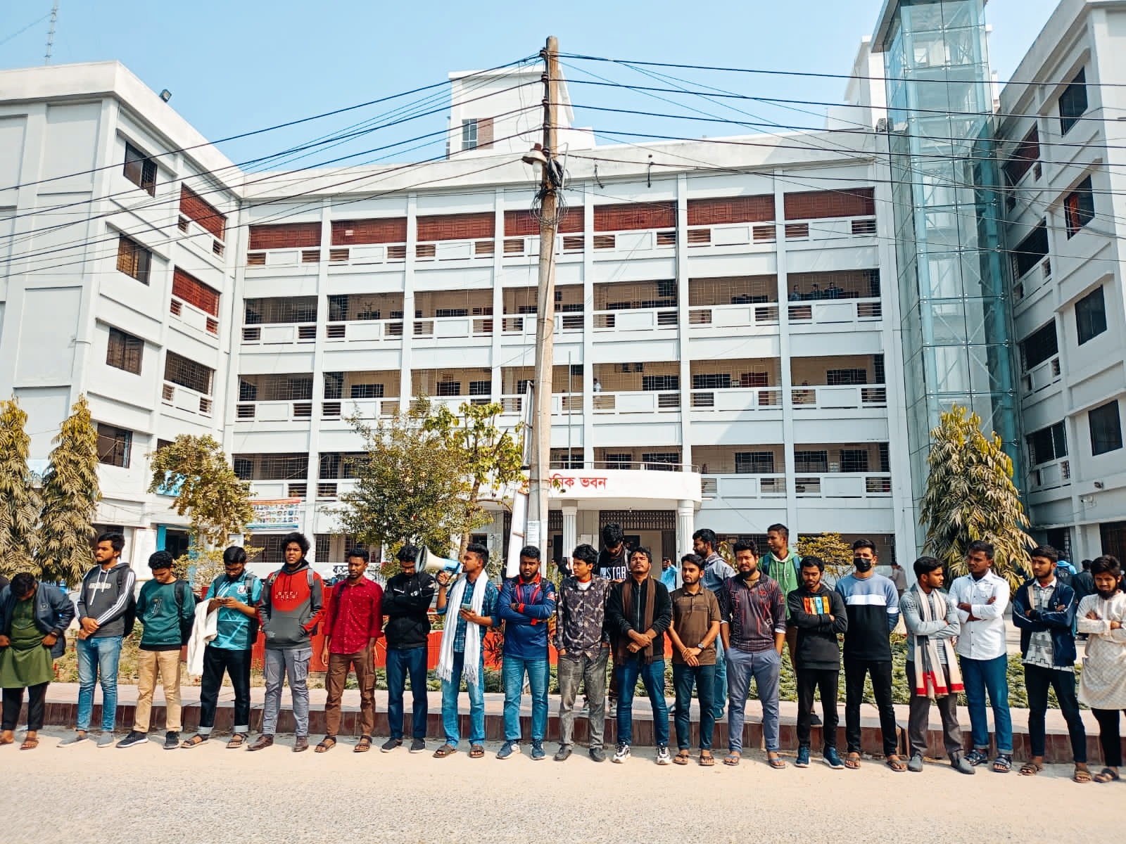 শনিবার (১৮ জানুয়ারি) বেলা সাড়ে ১১টায় বিশ্ববিদ্যালয়ের প্রশাসনিক ভবনের সামনে তারা এ মানববন্ধনের আয়োজন করেন। মানববন্ধনে বিশ্ববিদ্যালয়ের বিভিন্ন বিভাগের শিক্ষার্থীদের অংশগ্রহণে প্রশাসনকে ৩দিনের আল্টিমেটাম দিয়ে ১০ দফা দাবি তুলে ধরা হয়।