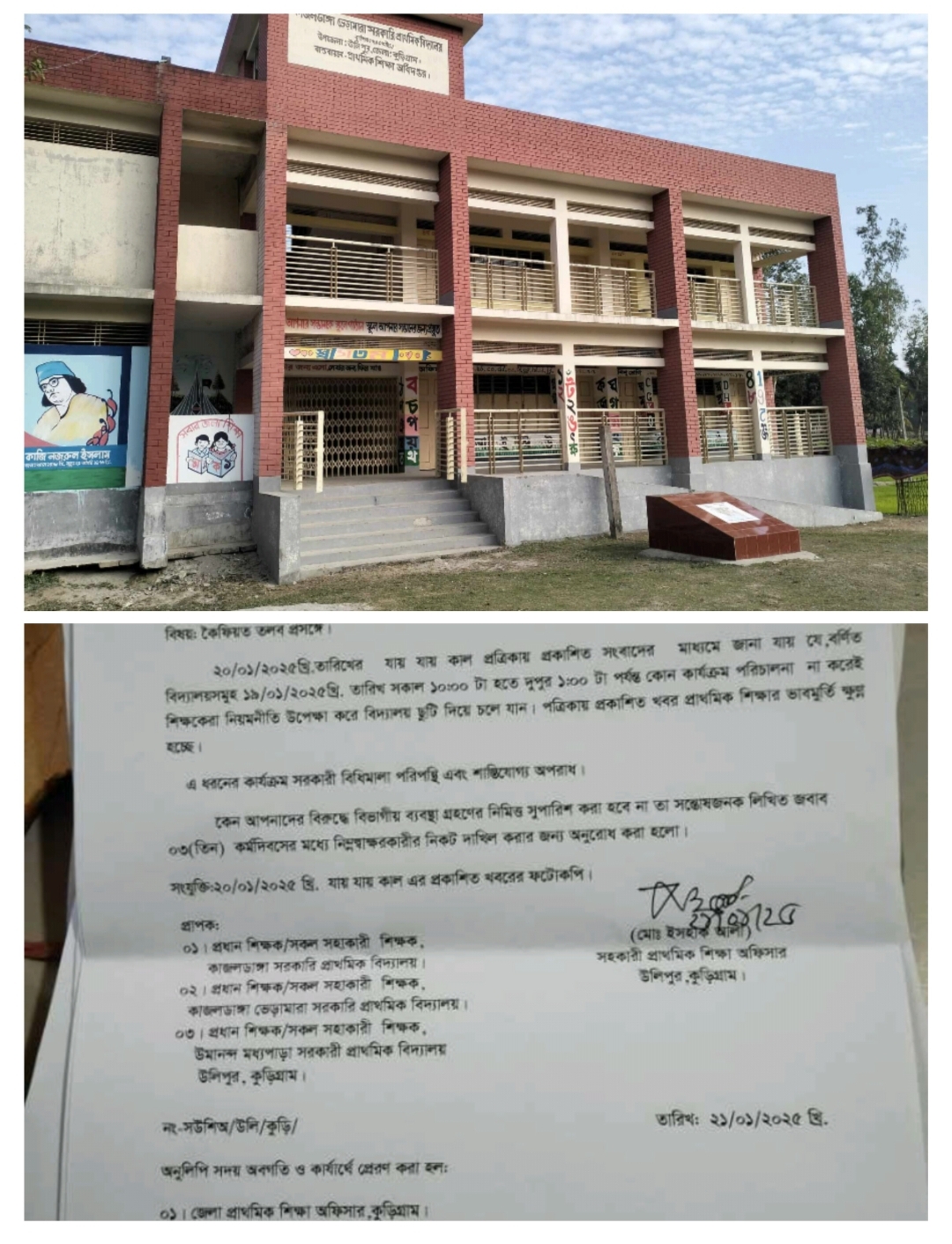 কুড়িগ্রাম জেলার উলিপুর উপজেলার তিনটি প্রাথমিক বিদ্যালয়ের প্রধান ও সহকারী শিক্ষকদের কারণ দর্শানোর নোটিশ (শোকজ) দিয়েছে উপজেলা প্রাথমিক শিক্ষা অফিস। মঙ্গলবার (২১ জানুয়ারি) এ নোটিশ ইস্যু করা হয়।