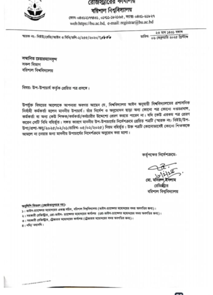 এ বিষয়টি জানতে চাইলে উপ-উপাচার্য অধ্যাপক ড. গোলাম রব্বানি বলেন, ব‌রিশাল বিশ্ব‌বিদ‌্যালয় আইন এর ১১(ক) এর ২ নং ধারা অনুযায়ী বিশ্ব‌বিদ‌্যাল‌য়ের একা‌ডেমিক দা‌য়িত্ব পালন কর‌বে প্রো‌-ভি‌সি। আমি ‌প্রো‌-ভি‌সি প‌দে যোগদা‌নের পর বিগত তিন মা‌সের ম‌ধ্যে মৌ‌খিক ও লি‌খিতভা‌বে দায়িত্ব বু‌ঝি‌য়ে দেয়ার জন‌্য উপাচার্য ম‌হোদয়‌কে বারংবার অনু‌রোধ ক‌রে‌ছি। কিন্তু দু:খজনক হ‌লেও স‌ত্যি যে, উপাচার্য ম‌হোদয়‌ অদ‌্যাব‌ধি আমা‌কে একা‌ডে‌মিক দায়িত্ব বু‌ঝি‌য়ে দেয়ার পদ‌ক্ষেপ গ্রহণ ক‌রেন নি। এমতাবস্থায়, ব‌রিশাল বিশ্ব‌বিদ‌্যাল‌য়ের একা‌ডে‌মিক কার্যক্রম দেখবা‌ল ও দা‌য়ি‌ত্ব পাল‌নের অংশ হি‌সে‌বে একা‌ডে‌মিক কার্যক্রমের অগ্রগ‌তি ও সা‌র্বিক অবস্থা জানার জন‌্য আমি বিভাগীয় চেয়ারম‌্যানদের সঙ্গে মিটিং আহবান করি কিন্তু পাল্টাচিঠি বিধিসম্মত নয় ও বিবৃতকর৷