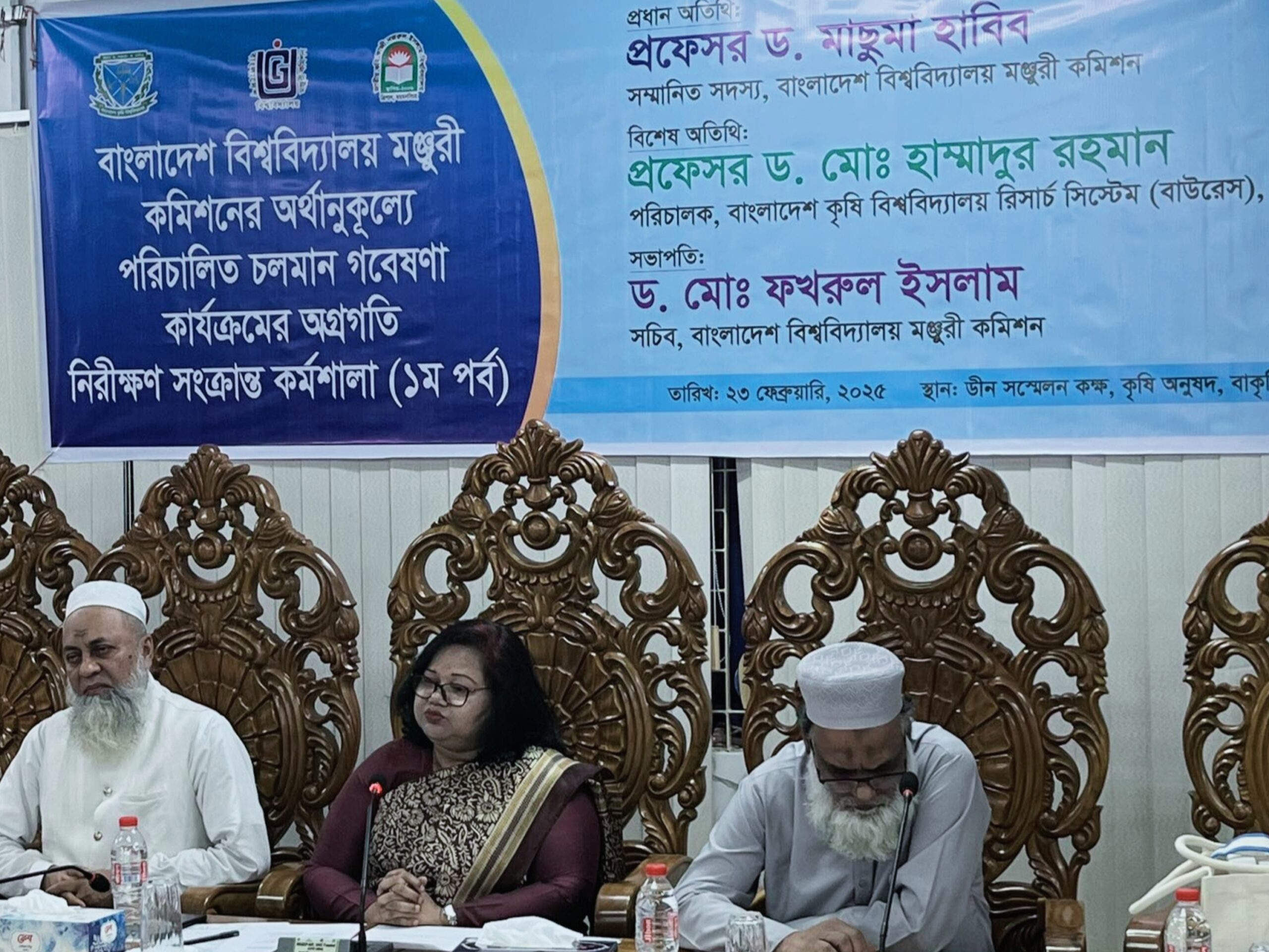 বাংলাদেশ বিশ্ববিদ্যালয় মঞ্জুরী কমিশন (ইউজিসি) এর অর্থানুকূল্যে পরিচালিত বাংলাদেশ কৃষি বিশ্ববিদ্যালয়ে (বাকৃবি) চলমান গবেষণা কার্যক্রমের অগ্রগতি নিরীক্ষণ সংক্রান্ত কর্মশালা অনুষ্ঠিত হয়েছে।