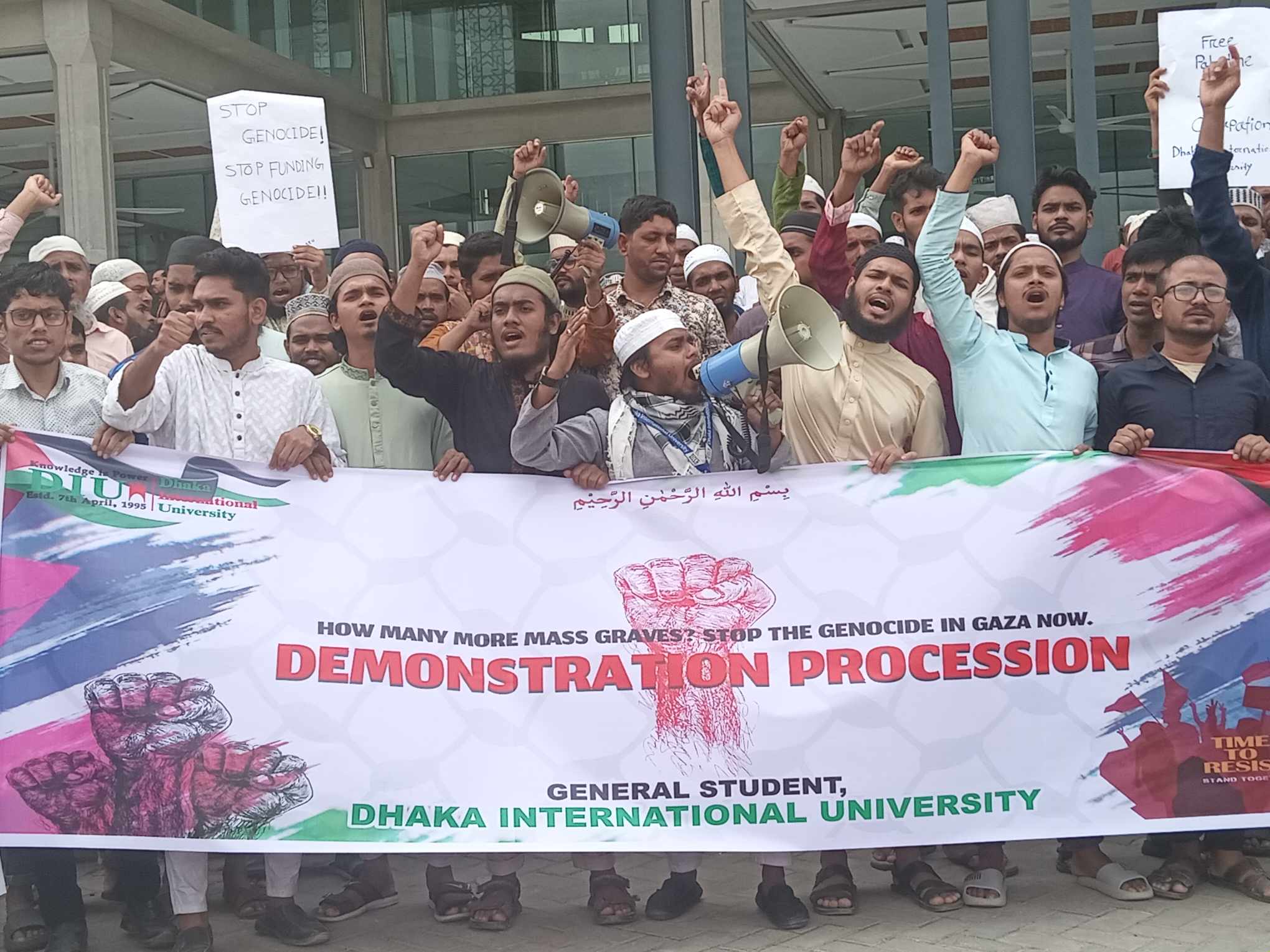 বিক্ষোভ মিছিলটি বিশ্ববিদ্যালয়ের নতুন ভবন থেকে শুরু হয়ে ইউনাইটেড ইন্টারন্যাশনাল ইউনিভার্সিটির (ইউআইইউ) সামনের সড়ক প্রদক্ষিণ করে পুনরায় ডিআইইউ নতুন ভবনের সামনে এসে শেষ হয়। মিছিলে অংশগ্রহণকারীরা বিভিন্ন ধরনের প্রতিবাদী প্ল্যাকার্ড বহন করেন, যেখানে ইসরায়েল ও ভারতীয় পণ্য বর্জনের আহ্বান, ফিলিস্তিনের মানবাধিকারের পক্ষে স্লোগান এবং গণহত্যা বন্ধের দাবি জানানো হয়। প্ল্যাকার্ডগুলোতে “ইসরাইল ও ভারতীয় পণ্য বর্জন করুন, ঈমানী দায়িত্ব পালন করুন”, “হিউম্যান রাইটস ফর ফিলিস্তিন”, “স্টপ জেনোসাইড, স্টপ ফান্ডিং জেনোসাইড”, “ফ্রম দ্যা রিভার টু দ্যা সী, ফিলিস্তিন উইল বি ফ্রি” ইত্যাদি স্লোগান লেখা ছিল। বিক্ষোভ সমাবেশে বাংলাদেশ গণতান্ত্রিক ছাত্র সংসদের সংগঠক মুহতাসিম ফুয়াদ, বৈষম্যবিরোধী ছাত্র আন্দোলন ডিআইইউ’র আহ্বায়ক মো. রফিকুল ইসলাম, সদস্য সচিব মো. আফিকুজ্জামান কাব্য, ইসলামী ছাত্র আন্দোলন সম্মিলিত বেসরকারি বিশ্ববিদ্যালয় ফোরামের সাধারণ সম্পাদক শামীম মাতুব্বর, আবু সাঈদসহ বিভিন্ন ছাত্র সংগঠনের নেতৃবৃন্দ উপস্থিত ছিলেন।