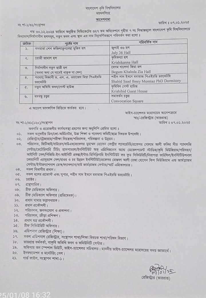 আদেশনামায় বলা হয়েছে, ‘গত বছরের ৩০ ডিসেম্বর তারিখে অনুষ্ঠিত সিন্ডিকেটের ৩২৭ তম অধিবেশনে গৃহীত ৭ নং সিদ্ধান্তমূলে বাংলাদেশ কৃষি বিশ্ববিদ্যালয়ে বিদ্যমান/নির্মাণাধীন হলসমূহ, নতুন ভবন এবং স্থান এর নাম পরিবর্তন হয়েছে।