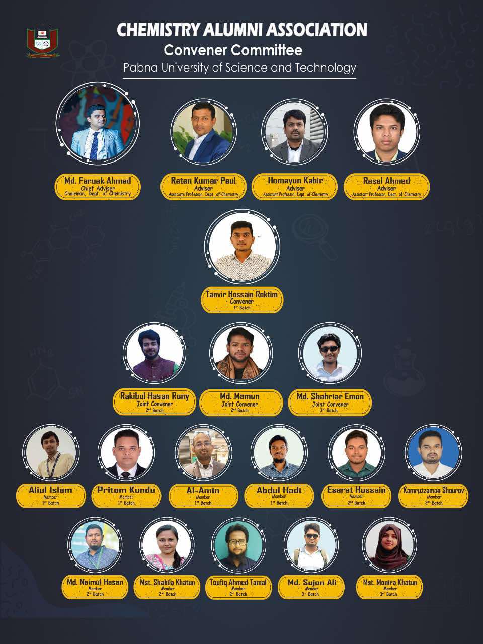 অ্যালামনাই অ্যাসোসিয়েশনের প্রধান উপদেষ্টা হিসেবে নির্বাচিত হয়েছেন রসায়ন বিভাগের চেয়ারম্যান মো: ফারুক আহমেদ এবং বাকি উপদেষ্টারা হলেন রসায়ন বিভাগের সহযোগী অধ্যাপক রতন কুমার পাল, সহকারী অধ্যাপক হুমায়ুন কাবির এবং সহকারী অধ্যাপক রাসেল আহমেদ। আহ্বায়ক হিসেবে নির্বাচিত হয়েছেন রসায়ন বিভাগের প্রথম ব্যাচের শিক্ষার্থী তানভীর হোসেন রক্তিম, যুগ্ম আহ্বায়ক দ্বিতীয় ব্যাচের রাকিবুল হাসান রনি এবং একই ব্যাচের মো: মামুন সহ তৃতীয় ব্যাচের মো: শাহরিয়ার ইমন ।