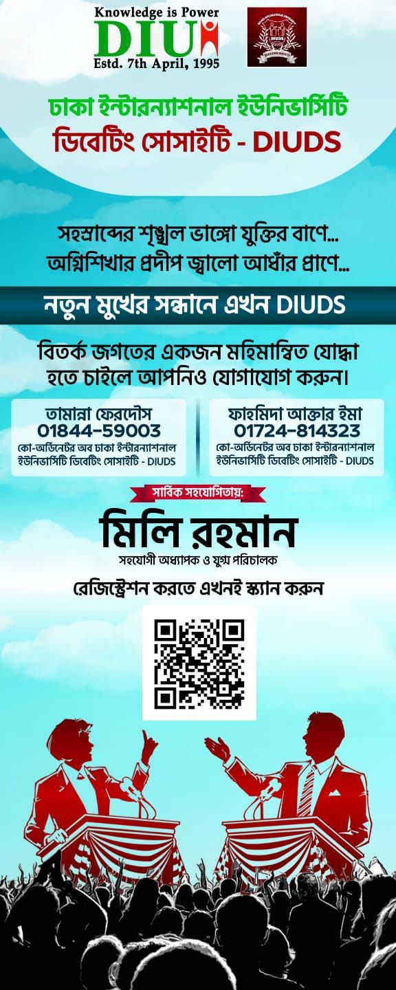 বুধবার (১৩ মার্চ) এই মর্মে ঢাকা ইন্টারন্যাশনাল ইউনিভার্সিটি ডিবেটিং সোসাইটি-DIUDS কর্তৃপক্ষের এক ক্ষুদে বার্তায় এ তথ্যটি জানানো হয় ১৯৯৫ সালে পথচলার শুরু থেকে ডিআইইউডিএস জাতীয় বিতর্ক প্রতিযোগিতা, আন্তঃবিশ্ববিদ্যালয়, আন্তঃকলেজ, বিটিভি, এটিএন বাংলা, এশিয়ান টিভি সহ অসংখ্য বিতর্ক মঞ্চে নিজেদের শ্রেষ্ঠত্ব প্রমাণ করেছে। যুক্তির তীক্ষ্ণতায় সমৃদ্ধ এই সংগঠনটি তর্কযোদ্ধাদের এক উর্বর ভূমি হিসেবে পরিচিত। “যুক্তিবাদী, মুক্তবুদ্ধি, সৃজনশীল মননশীলতা এবং পরমত সহনশীলতার দীক্ষায় নতুন নিজেকে আবিষ্কার করুন, বিশ্বমঞ্চে উপস্থাপন করুন এক অন্য আপনাকে” – এই আহ্বানে ডিআইইউডিএস আয়োজন করছে তাদের চতুর্থ আন্তঃবিভাগ বিতর্ক প্রতিযোগিতা। মেধা ও মনন বিকাশের এক অনন্য সুযোগ এই বিতর্ক প্রতিযোগিতা। আপনার সুপ্ত প্রতিভাকে জাগ্রত করে জিতে নিন ৮০ হাজার টাকার স্কলারশিপ, সার্টিফিকেট, ট্রফি ও মেডেল। আর দেরি না করে আজই আপনার দলের নিবন্ধন সম্পন্ন করুন এবং নিজেকে প্রমাণ করুন। তুলে ধরুন আপনার বিভাগের শ্রেষ্ঠত্ব।
