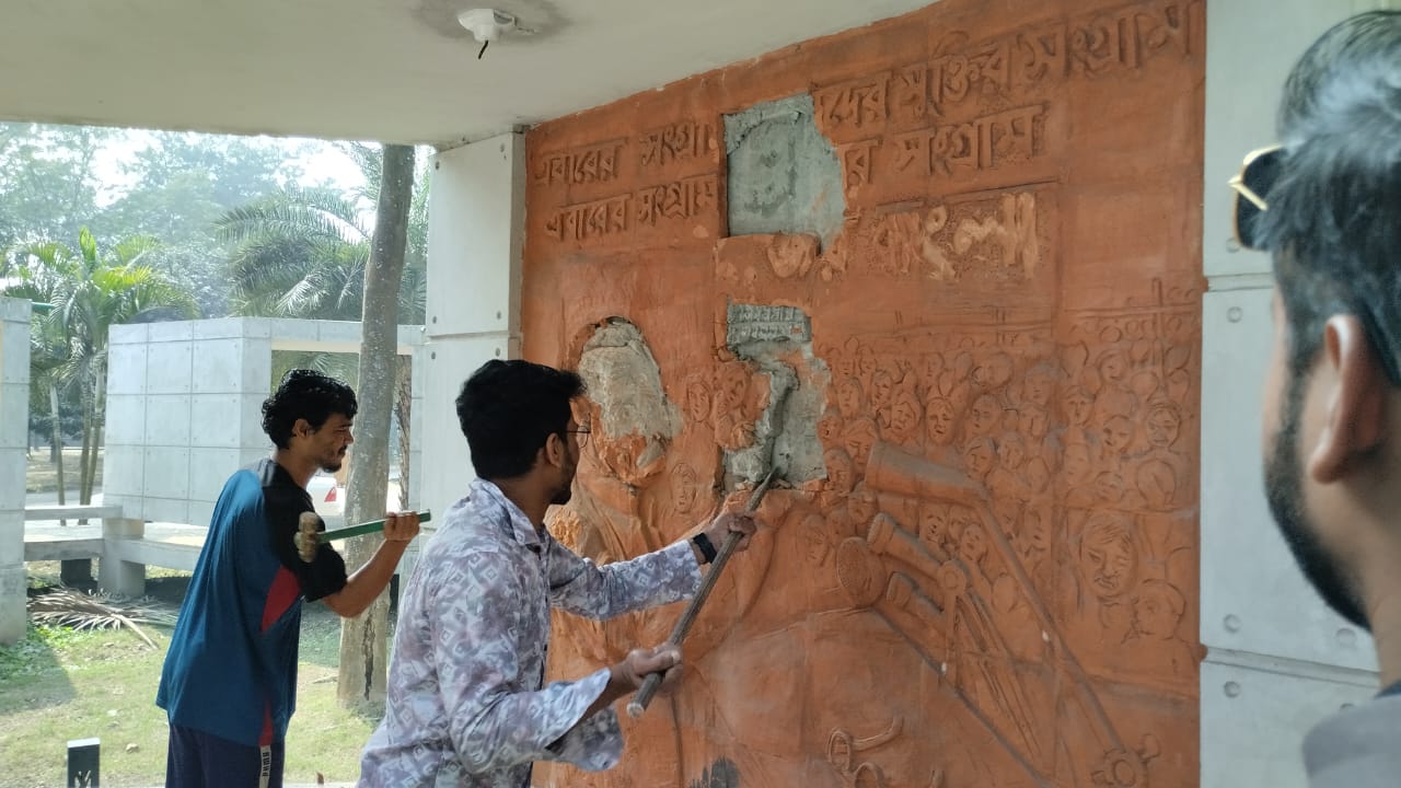 বৃহস্পতিবার দুপুর ১২ টায় শিক্ষার্থীরা বিশ্ববিদ্যালয়ের ওয়াজেদ ভবনের সামনে জড়ো হয়ে জড়ো হয়ে বঙ্গবন্ধুর ম্যুরাল ও শেখ হাসিনার নামফলক ভেঙে ফেলেন। বঙ্গবন্ধু হলের নাম ভেঙে ফেলে সেখানে বিজয় ২৪ নামকরণ করা হয়। এর আগে শেখ রাসেল হলের নাম ভেঙে ফেলে শিক্ষার্থীরা।