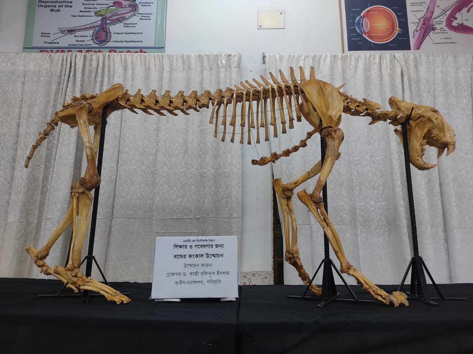 অধ্যাপক ড. মো. সাইদুর রহমানের সার্বিক তত্ত্বাবধানে বিশ্ববিদ্যালয়ের বর্তমান শিক্ষার্থী এবং গবেষকদের দীর্ঘ দিনের পরিশ্রমের পর প্রস্তুত হয় বহুল আকাঙ্ক্ষিত কঙ্কাল। বন্যপ্রাণী গবেষণার ক্ষেত্রে বাঘের কঙ্কাল উক্ত অনুষদের শিক্ষার্থীদের জ্ঞান অর্জনের আরেকটি নতুন দ্বার উন্মোচন করবে বলে আশা রাখছেন বিভাগের শিক্ষকবৃন্দ। কঙ্কাল প্রস্তুতে সার্বিকভাবে সহায়তা করেছেন এনাটমি এন্ড হিস্টোলজি বিভাগের চেয়ারম্যান অধ্যাপক ড. তোফাজ্জল হোসেন এবং তৈরিতে অংশগ্রহণ করেছেন ডা. তারিকুর রহমান তারেক, সানজিদ, বাতেন, লোকমান, আশরাফ, পিয়াস, আমিনুল, জামিনসহ আরো অনেক শিক্ষার্থীবৃন্দ।