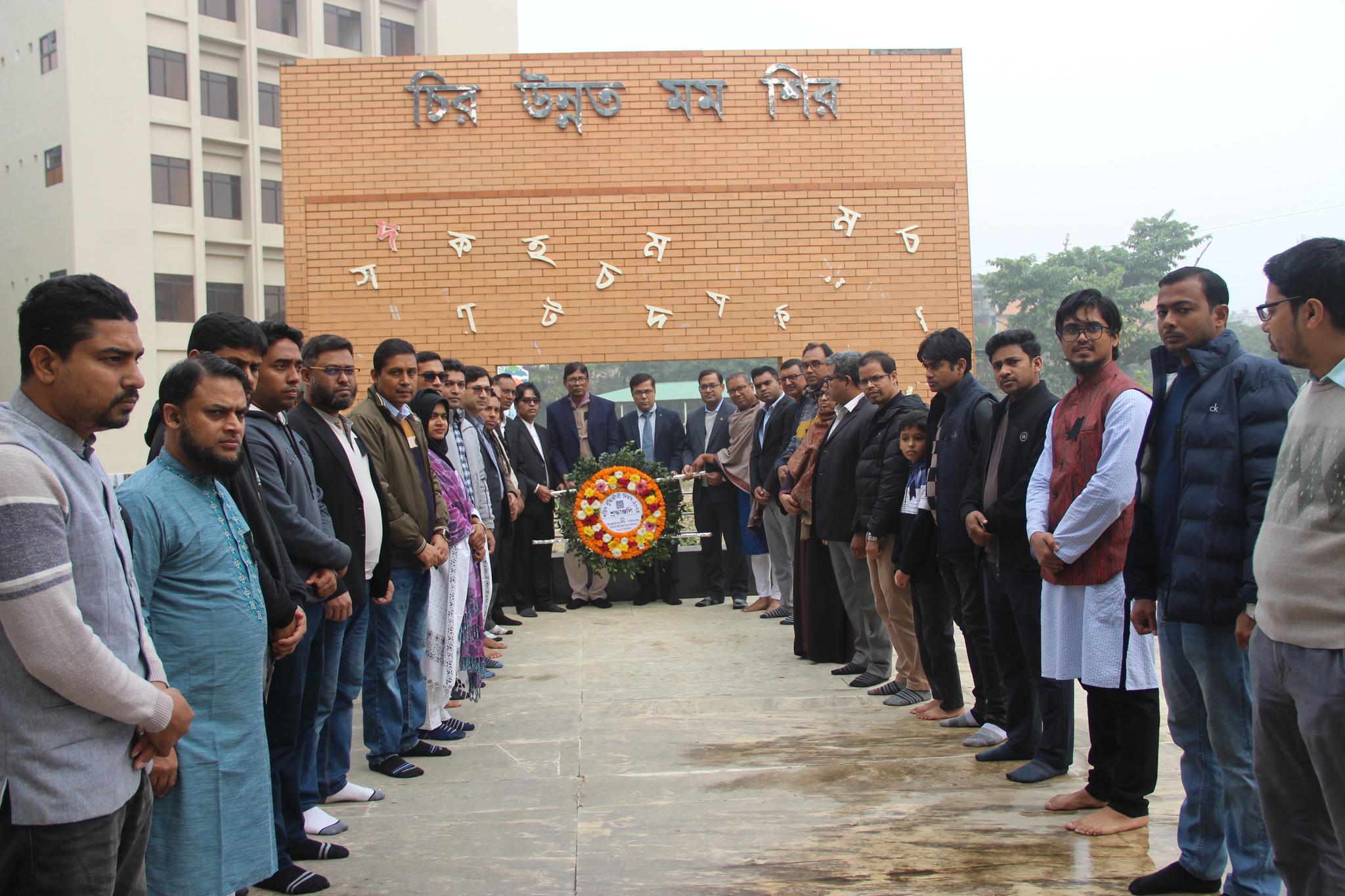 এরপর শহীদ বুদ্ধিজীবীদের গভীর শ্রদ্ধা জানাতে বিশ্ববিদ্যালয় পরিবারের পক্ষ হতে চির উন্নত মম শির এ পুষ্পস্তবক অর্পণ করেন বিশ্ববিদ্যালয়ের উপাচার্য প্রফেসর ড. মো. জাহাঙ্গীর আলম। এরপর অনুষদীয় ডিন ও শিক্ষক সমিতির পক্ষ হতে পুষ্পস্তবক অর্পণ করে শ্রদ্ধা নিবেদন করা হয়। শ্রদ্ধা নিবেদন শেষে দাঁড়িয়ে এক মিনিট নিরবতা পালন করে শহীদ বুদ্ধিজীবীদের প্রতি সম্মান প্রদর্শন করা হয়।