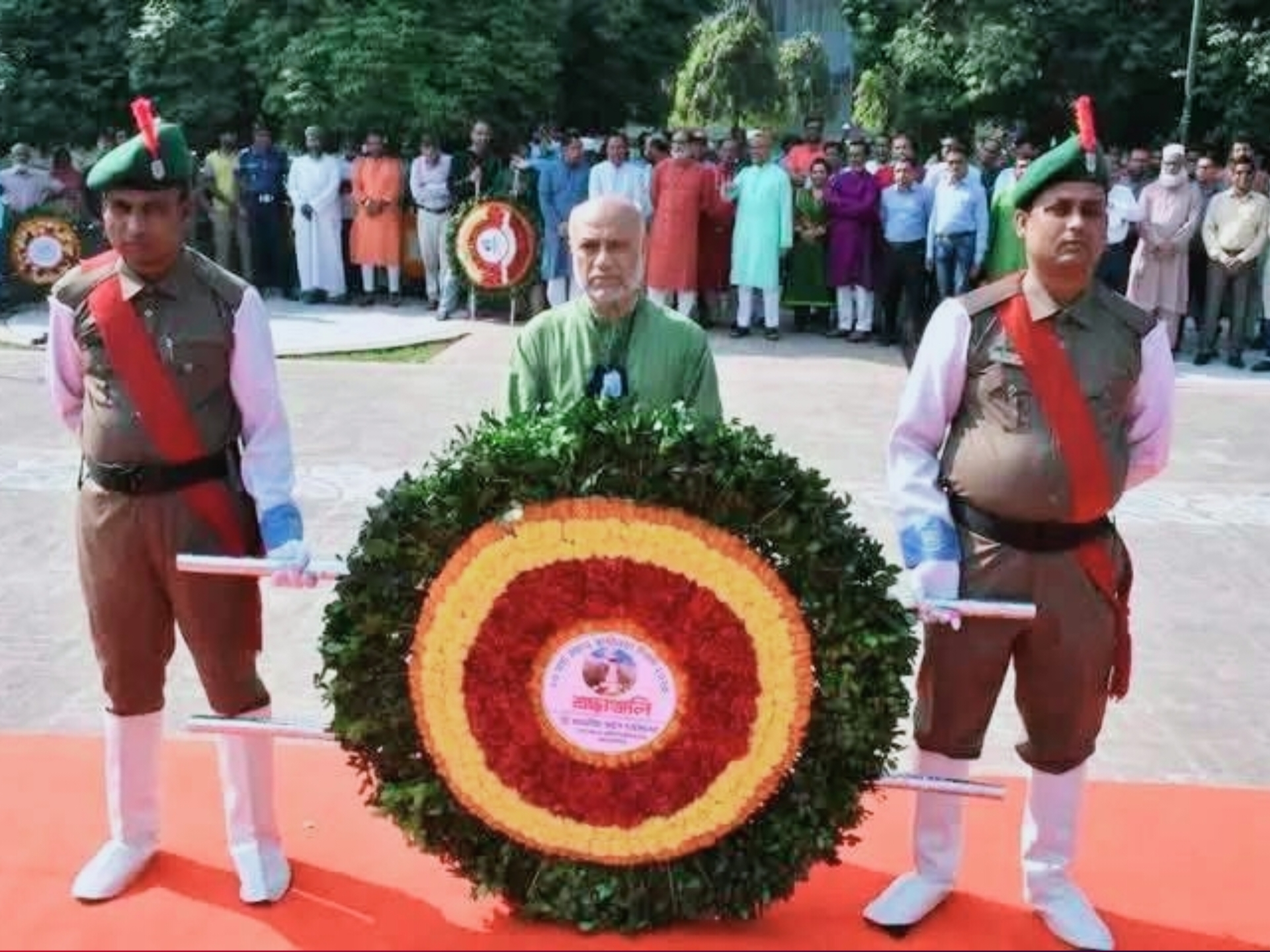 জাতীয় দিবস উদযাপন কমিটির সভাপতি ও ছাত্র বিষয়ক উপদেষ্টা অধ্যাপক ড. মো. শহীদুল হক-এর সভাপতিত্বে পুষ্পস্তবক অর্পণ অনুষ্ঠানে বিশেষ অতিথি হিসেবে উপস্থিত ছিলেন শিক্ষক সমিতির সভাপতি অধ্যাপক ড. মো. রফিকুল ইসলাম সরদার, প্রক্টর অধ্যাপক ড. মো. আব্দুল আলীম। শিক্ষক সমিতির সাধারণ সম্পাদক অধ্যাপক ড. মো. আসাদুজ্জামান সরকারের পরিচালনায় ছাত্র বিষয়ক উপদেষ্টা ও প্রক্টর কার্যালয়, শিক্ষক সমিতি, প্রভোস্ট পরিষদ, ফ্যাসিবাদবিরোধী শিক্ষক সংগঠন, ফ্যাসিবাদবিরোধী অফিসার সংগঠন, সকল আবাসিক হল প্রশাসন, বাংলাদেশ জাতীয়তাবাদী ছাত্রদল, মহিলা সংঘ, সমাজতান্ত্রিক ছাত্র ফ্রন্ট, বাংলাদেশ ছাত্র ইউনিয়ন, ৩য় শ্রেণীকর্মচারী পরিষদ, ৪র্থ শ্রেণীকর্মচারী সমিতি, নিরাপত্তা কাউন্সিল, প্রবীণ শিক্ষক-কর্মকর্তা হিতৈষী সমিতি, কৃষি বিশ্ববিদ্যালয় কলেজসহ বিশ্ববিদ্যালয়ের বিভিন্ন সামাজিক, পেশাজীবী ও স্বেচ্ছাসেবী সংগঠনের পক্ষ থেকে শিক্ষক, শিক্ষার্থী, কর্মকর্তা, কর্মচারী মুক্তিযুদ্ধ স্মৃতিস্তম্ভে পুষ্পস্তবক অর্পণ করেন।