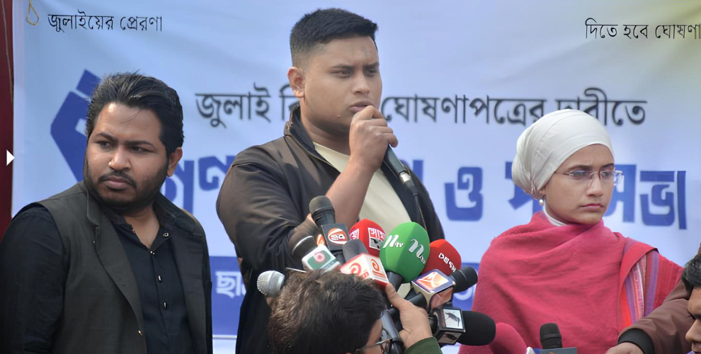 মঙ্গলবার (১৪ জানুয়ারি) সকাল ১১টায় নারায়ণগঞ্জের চাষাঢ়া কেন্দ্রীয় শহীদ মিনারে বৈষম্যবিরোধী ছাত্র আন্দোলন ও জাতীয় নাগরিক কমিটির উদ্যোগে জুলাই বিপ্লবের ঘোষণাপত্রের প্রচারণা ও লিফলেট বিতরণের সময় সংক্ষিপ্ত সমাবেশে তিনি এ কথা বলেন।