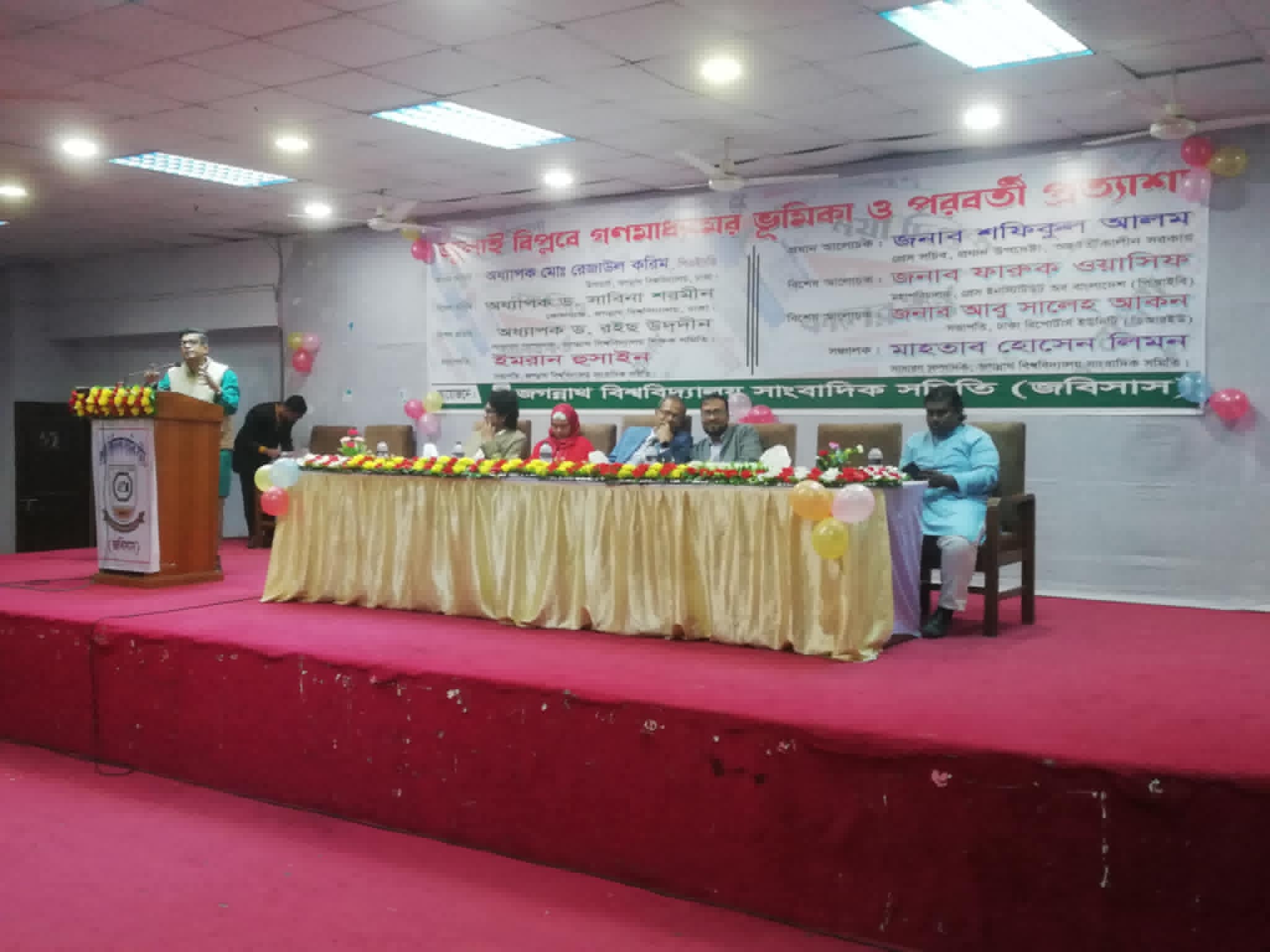 জবিসাসের সাধারণ সম্পাদক মাহতাব হোসেন লিমনের উপস্তাপনায় অনুষ্ঠানে আরও বক্তব্য দেন- জবির  শিক্ষক সমিতির সাধারণ সম্পাদক অধ্যাপক ড. মো. রইছ উদ্দীন ও বিশ্ববিদ্যালয়ের কোষাধ্যক্ষ অধ্যাপক ড. সাবিনা শরমীন। এ ছাড়া অনুষ্ঠানে মূল প্রবন্ধ উপস্থাপন করেন জবি সাংবাদিক সমিতির সহসভাপতি আসাদুল ইসলাম।